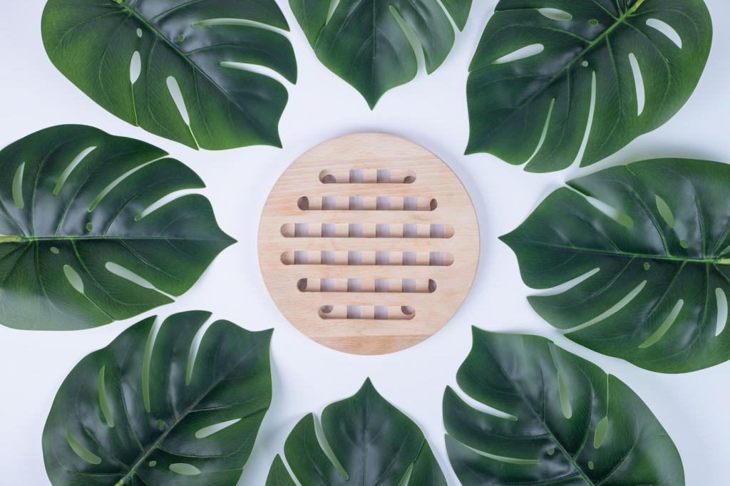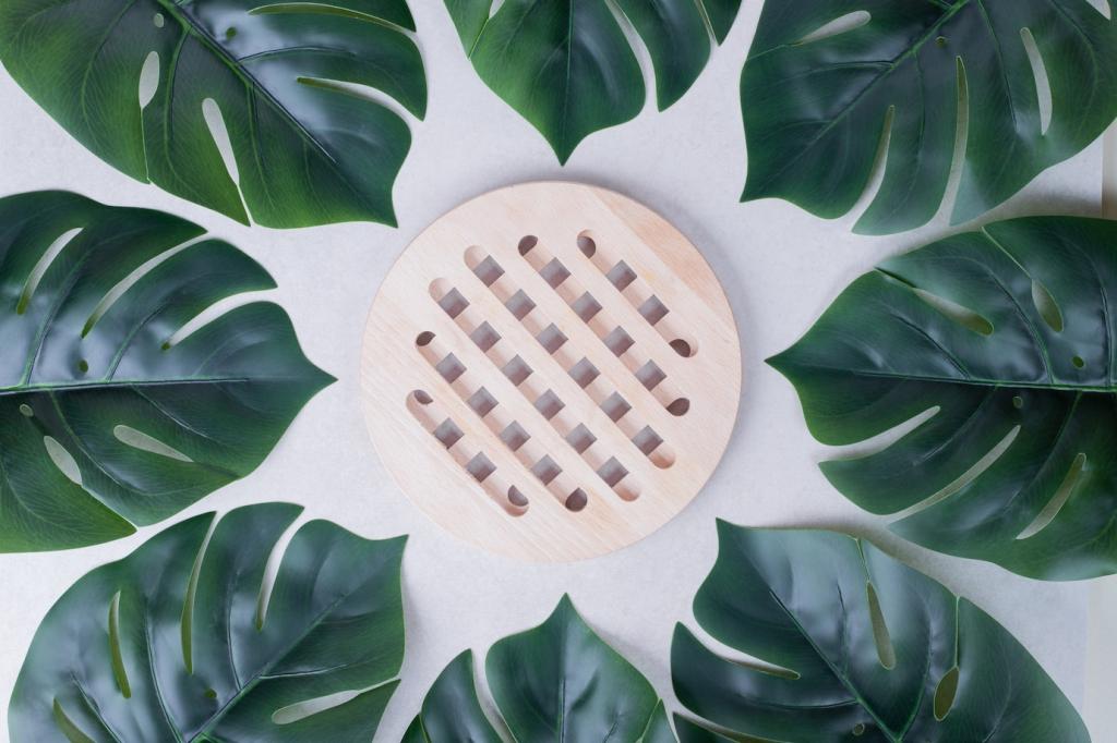 Recycelte Metalle, Glas und Textilien sparen Primärrohstoffe und Energie. Teppiche aus recyceltem PET überraschen mit Robustheit und angenehmer Haptik. Achte auf transparente Herstellerangaben und prüfe, ob Ersatzteile und Reparaturservices verfügbar sind.